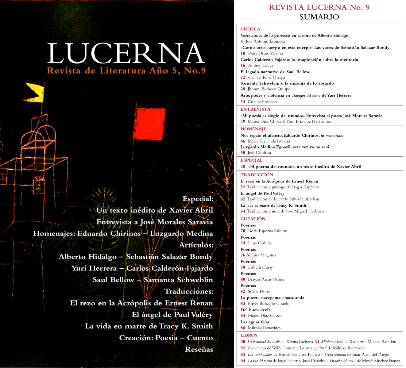La novena edición de Lucerna trae como rescate literario la publicación facsimilar de un texto inédito del poeta peruano Xavier Abril. En la sección de crítica se publican artículos sobre los escritores peruanos Alberto Hidalgo, Sebastián Salazar Bondy y Carlos Calderón Fajardo, los narradores Saul Bellow, Samanta Schweblin y Yuri Herrera. Además, inauguramos nuestra sección de entrevistas con una larga conversación con el poeta peruano radicado en Alemania, José Morales Saravia. En nuestra sección de homenajes rendimos tributo a los poetas Eduardo Chirinos y Luzgardo Medina. En nuestra sección de traducciones, incluimos versiones castellanas del «Rezo en la Acrópolis» de Ernest Renan, «El ángel», último texto de Paul Valéry, y una selección de poemas de la poeta norteamericana Tracy K. Smith. En nuestra sección de creación literaria, poemas y cuentos de autores y autoras de diversas regiones del Perú. Finalmente, reseñas de libros publicados recientemente.