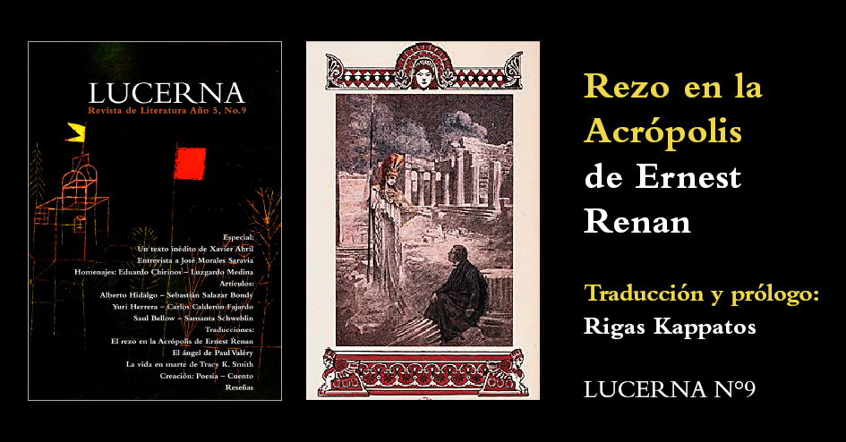En nuestra sección de traducciones de la novena edición de Lucerna se incluye el famoso «Rezo en la Acrópolis» del escritor francés Ernest Renan (1823-1892), un hermoso y exaltado texto de devoción por la belleza y la perfección de la cultura griega, encarnadas en la Acrópolis y la diosa Palas Atenea. Este texto fue publicado en 1883 y tuvo su origen en un viaje a Grecia realizado por Renan en 1865. La traducción estuvo a cargo del escritor y traductor griego Rigas Kappatos. Compartimos un fragmento de la introducción.