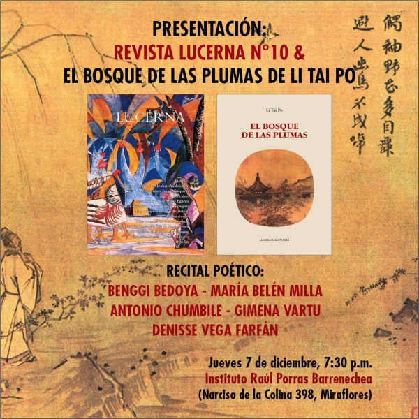 La revista literaria Lucerna presenta su décima edición este jueves 7 de diciembre a las 7:30 p.m. en el Instituto Raúl Porras Barrenechea (Narciso de la Colina 398, Miraflores). Con esta edición se publica el libro El bosque de las plumas, una antología poética del gran poeta clásico chino Li Tai Po, con traducción directa de Fernán Alayza y Ricardo Silva-Santisteban, en edición bilingüe y con ilustraciones a color. Esta publicación es la quinta entrega de nuestra colección de clásicos universales «Los alimentos terrestres».