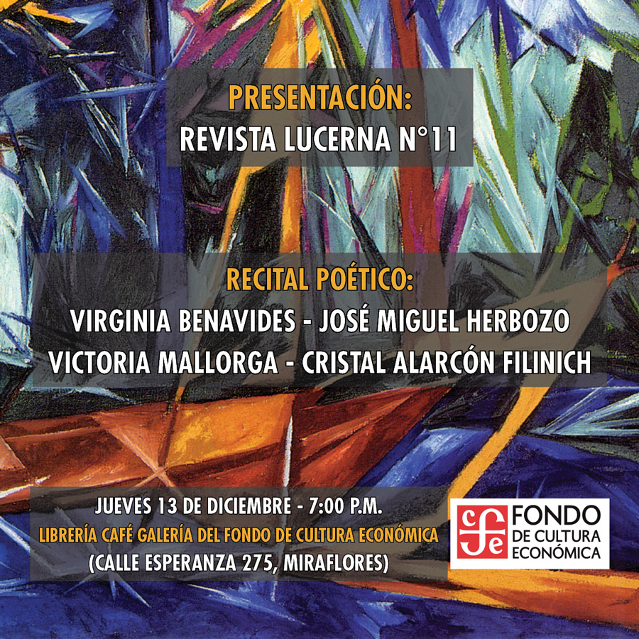 La revista literaria Lucerna presentará su undécima edición el jueves 13 de diciembre de 2018 a las 7 p.m. en la librería del Fondo de Cultura Económica (Calle Esperanza 275, Miraflores). Para celebrarlo se realizará un recital poético con la participación de Virginia Benavides, José Miguel Herbozo, Victoria Mallorga y Cristal Alarcón Filinich. El ingreso es libre y la revista estará disponible a precio especial de presentación.