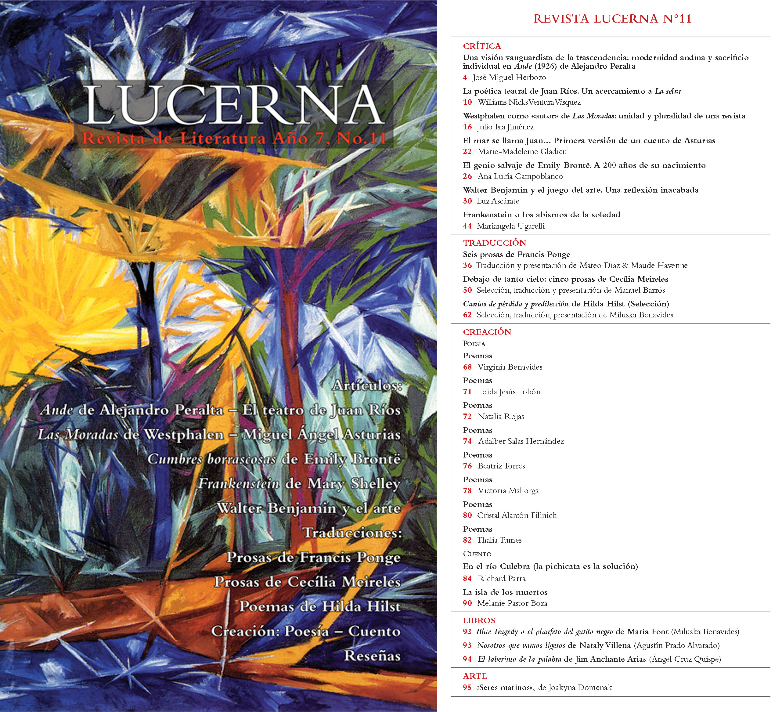 Sumario del undécimo número de Lucerna. En la sección de artículos, trabajos sobre Ande de Alejandro Peralta, el teatro del dramaturgo Juan Ríos, la revista Las Moradas de Emilio Adolfo Westphalen, un cuento del narrador guatemalteco Miguel Ángel Asturias, Cumbres Borrascosas de Emily Brontë por los 200 años del nacimiento de la escritora inglesa, Frankenstein de Mary Shelley, a propósito de los 200 años de su primera edición y sobre el filósofo Walter Benjamin y el arte. La sección de traducciones, como siempre bastante nutrida, incluye prosas del poeta francés Francis Ponge, prosas poéticas de la poeta brasileña Cecília Meireles y poemas de Hilda Hilst, también de Brasil. En la sección de creación, abundante poesía, con poetas peruanas, de Chile y Venezuela, y en narrativa, dos relatos. Incluimos también acuarelas de una joven artista plástica peruana y una ilustración a página completa de Mary Shelley. Finalmente, reseñas de libros recientes.
