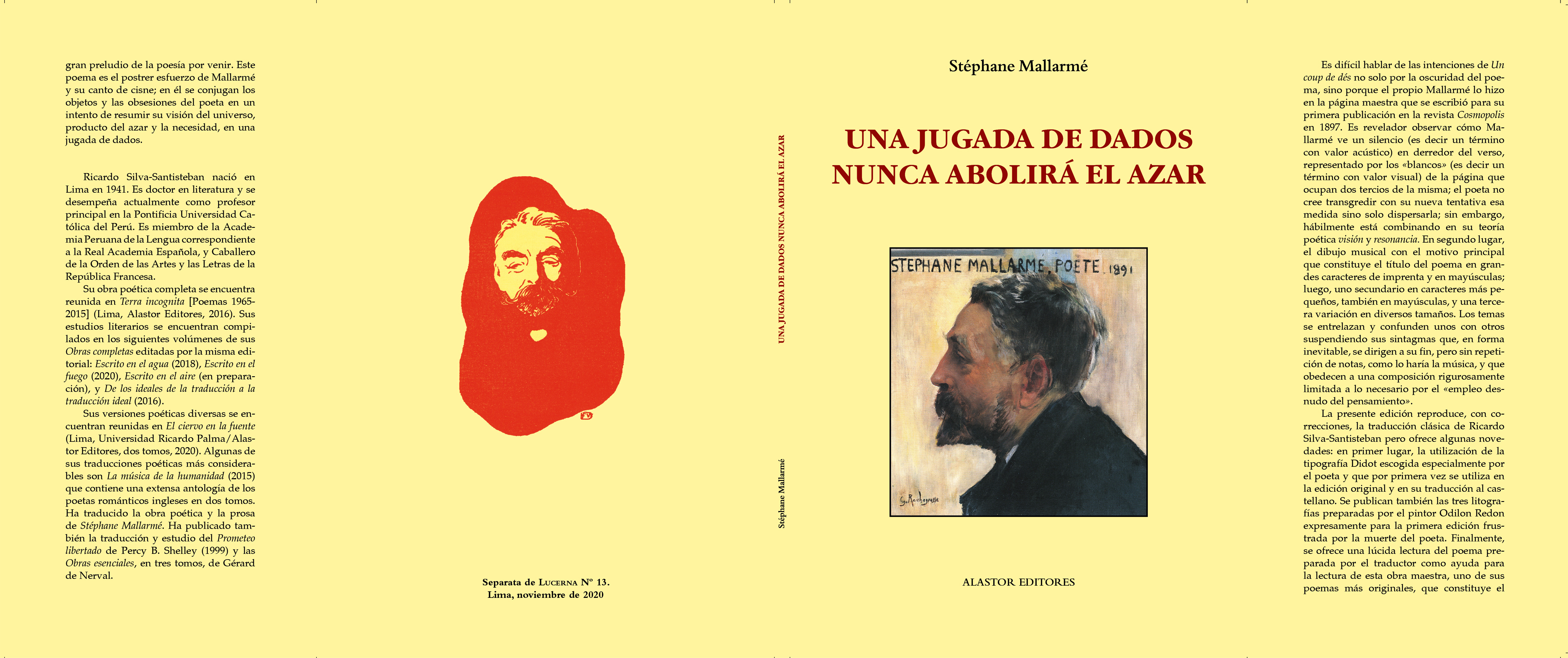 Con el decimotercer número de la revista Lucerna, se publica la sexta entrega de nuestra colección de clásicos universales «Los alimentos terrestres». Se trata de Una jugada de dados nunca abolirá el azar, el revolucionario poema del poeta francés Stéphane Mallarmé, con traducción y comentario de Ricardo Silva-Santisteban. Esta edición bilingüe incluye las tres litografías que Odilon Redon preparó para la frustrada primera edición, y el texto se ha compuesto en la tipografía elegida por el propio Mallarmé.